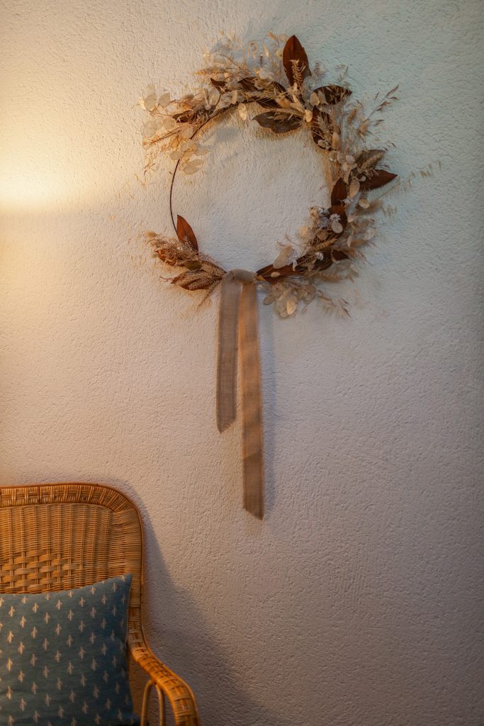 Raph : Il a fallu se retrousser les manches pour les remettre en état dès la première saison. Chineuse invétérée, il m’a été facile de redonner du charme aux différents espaces, les améliorant d’années en années pour le confort de nos hôtes et nous jouons avec la déco au gré des saisons. Les magnifiques couronnes de fleurs séchées témoignent de notre coup de cœur pour le travail de Cécile et Nathalie de la ferme florale Butine. D’ailleurs, nous proposons ensemble des ateliers de fabrication de couronnes de fleurs, une activité ludique qui invite à l’harmonie.