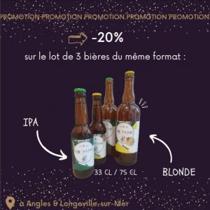-20% sur le lot de 3 bières de même contenance (références de votre choix) – Offre disponible uniquement dans les bureaux de Angles et Longeville-sur-Mer