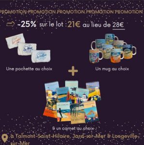 -25% sur le lot carnet-mug-pochette (références de votre choix), soit 21€ le lotOffre disponible dans les bureaux de tourisme de Jard-sur-Mer, Longeville-sur-Mer et Talmont-Saint-Hilaire