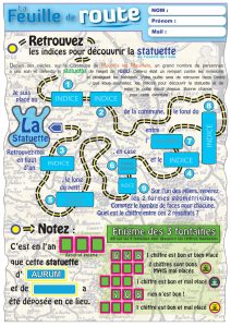 Votre quête sera de retrouver les indices permettant de découvrir la statuette de l’esprit de l’eau et de noter le code sur la feuille de route. A vous de retrouver les 9 indices (vous n’êtes pas obligés de la faire dans l’ordre des numéros), l’énigme des 3 fontaines et le nom complet de la statuette. Lorsque vous aurez trouvé tous les indices et le trésor, si vous voulez le gagner lors d’un tirage au sort à une date qui vous sera communiquée, vous aurez juste à déposer votre feuille de route dans la boîte à lettres de la mairie avec vos coordonnées.
