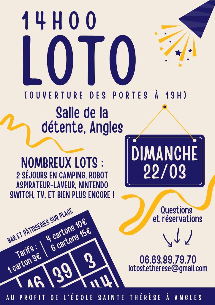 Agenda >>Fêtes populaires et animations de saison Loto Organisé par l'école Sainte Thérèse Description Ouverture des portes à 13H. Nombreux lots : 2 séjours en camping, robot, aspirateur-laveur, nintendo swith, TV et bien d’autres lots. 3€ le carton 10€ les 4 cartons 15€ les 6 cartons Bar et pâtisseries. Pratique Date(s) de la manifestation : Du 22/03/2026 au 22/03/2026 Horaires de la manifestation14:00 Vous rendre à cet endroit Adresse de l'offre : Salle de la détenteRoute de la Tranche85750 ANGLES Contact : Ecole Sainte Thérèse 06 63 89 79 70 lotostetherese@gmail.com Agenda Fêtes populaires et animations de saison